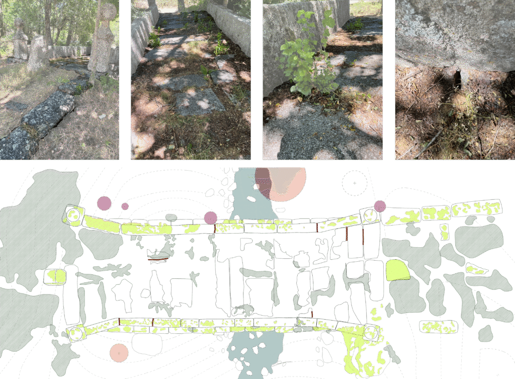 También destaca el desembarco de acceso al puente, del que todavía quedan restos de grandes losas de piedra, aunque en su mayoría se han perdido con el paso del tiempo.
